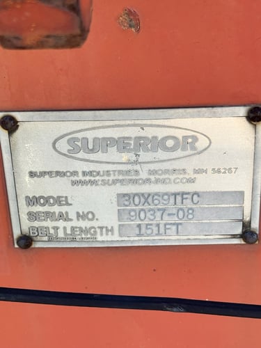 One (1) used and partially dismantled Superior model 30x69 truss frame conveyor, serial number 9037-08, size 30-inch-wide belt by 30-inch-deep truss by 69-foot long, powered by a 5-horsepower electric motor with a walkway, size 24-inch wide, and belt covers also known as conveyor hoods.