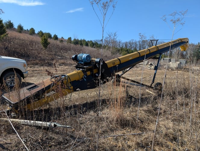 One (1) used Convey-All 2245 truck load conveyor, serial number 1650003, size 14-inch diameter tube by 22-inch-wide belt, and drive WEG 15 horsepower electric motor.